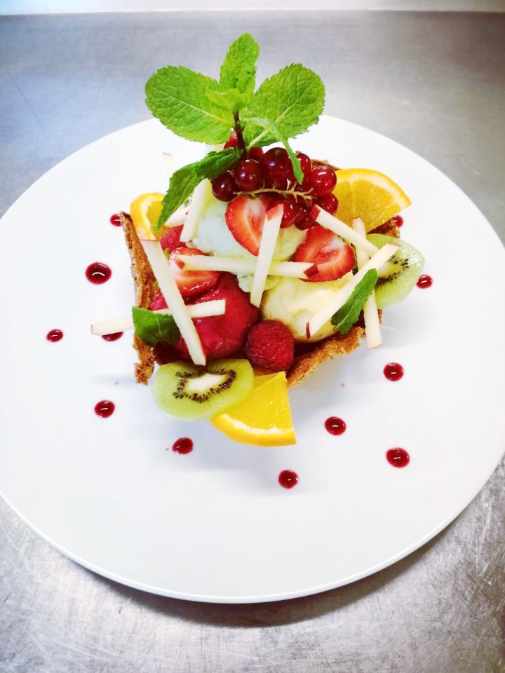 Sans oublier nos douceurs colorées et gourmandes tels que le macaron fraises pistaches au coulis de framboises, le meli mélo de fruits nuage de granit Smith, l'assiette gourmande de desserts, l'éclair au praliné craquant et mousse chocolat...
